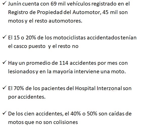 En este aspecto Olmedo mencionó que el 15 o 20% de los motociclistas accidentados tenían el casco puesto y el resto no. Hay un promedio de 114 accidentes por mes con lesionados y en la mayoría interviene una moto, y ese 80% de conductores de moto van sin casco», citó Olmedo recordando que «el paragolpe del que anda en moto es la cabeza y las lesiones en la cabeza suelen ser mortales».